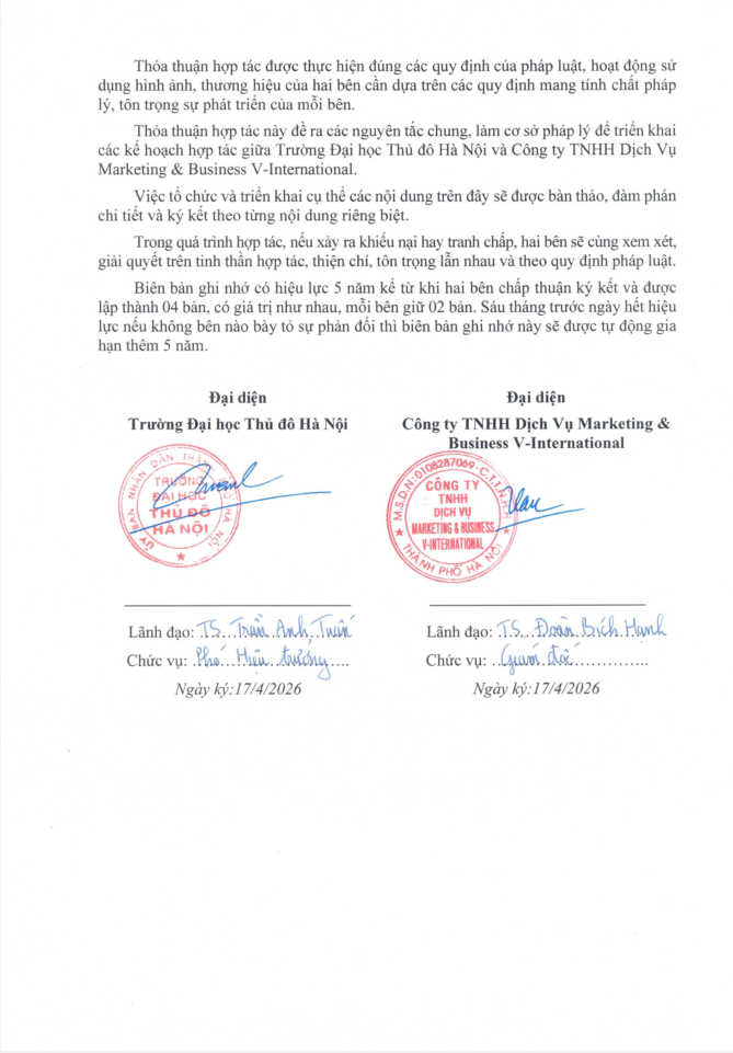 Finally, the HNMU V-International strategic partnership stands as a model for university-enterprise cooperation in Vietnam. By combining intellectual resources with practical business strategies, we are building a more resilient educational ecosystem. As we celebrate this formal signing, we look forward to the countless opportunities this alliance will create for the students and faculty of Hanoi Metropolitan University.